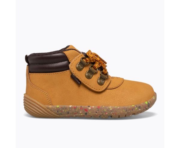 This on-trend boot is made with environmentally friendly materials and features an alternative closure with fixed laces for an easy fit and a hiker-inspired look. Its wide toe box and rounded outsole follow the natural shape of a child’s foot to ensure healthy foot development and its light, flexible outsole makes it a durable walker. Bonus: anti-stink lining helps reduce odorsFEATURES: • Leather upper • Alternative closure for easy on/off • Extra-wide toe box and outsole with rounded edges allow for proper foot development • Environmentally friendly materials in linings and outsole • Anti-stink lining helps reduce odors • Memory foam footbed for all-day comfort• Multi-directional flex grooves in outsole for maximum flexibility • Lightweight, non-marking rubber outsole with extra grip for superior traction